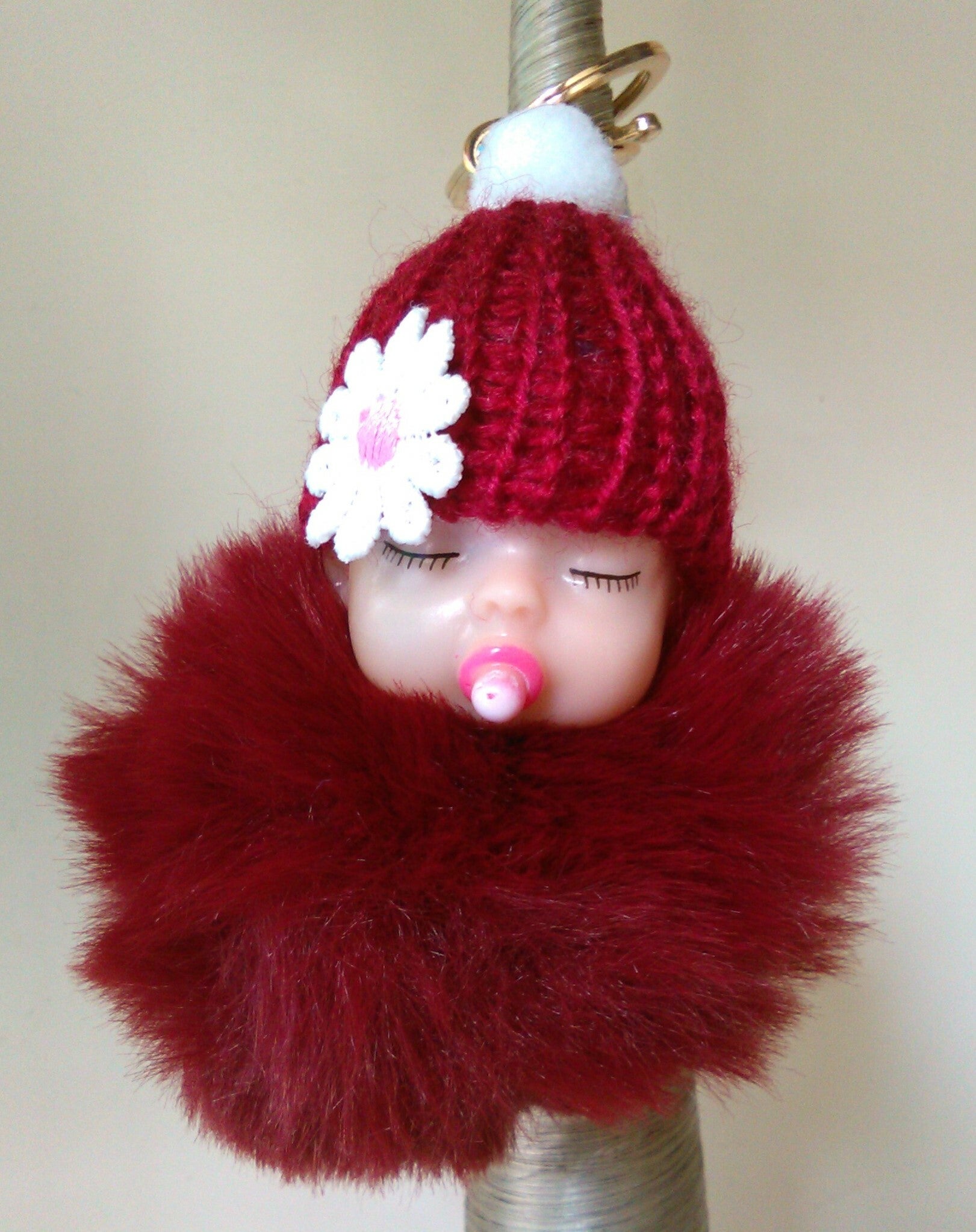 zeer toffe sleutelhanger met een popjeen is afgewerkt met een rode pluizige pomponmooi om te krijgen maar ook als geschenk...de lengte is 16 cm