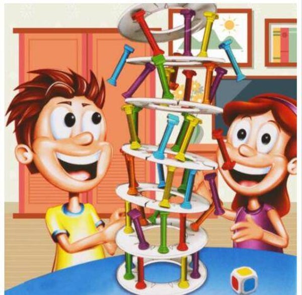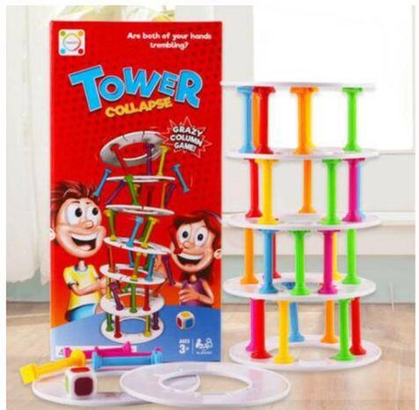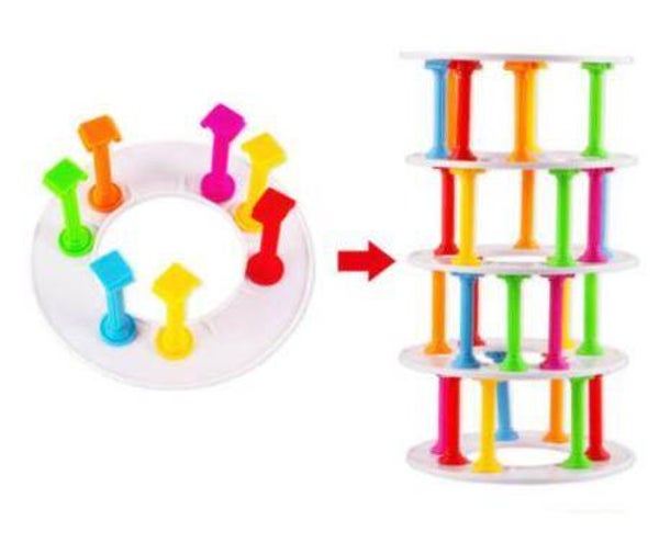 deze toren bevat een verscheidenheid aan kleurrijke zuilen en ringen en een Ludo-spel. test je vaardigheden en begin met het spelen van het gekke kolomspel! gooi de dobbelstenen om te zien welke kleur kolom je aan de toren moet toevoegen.