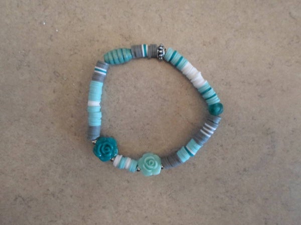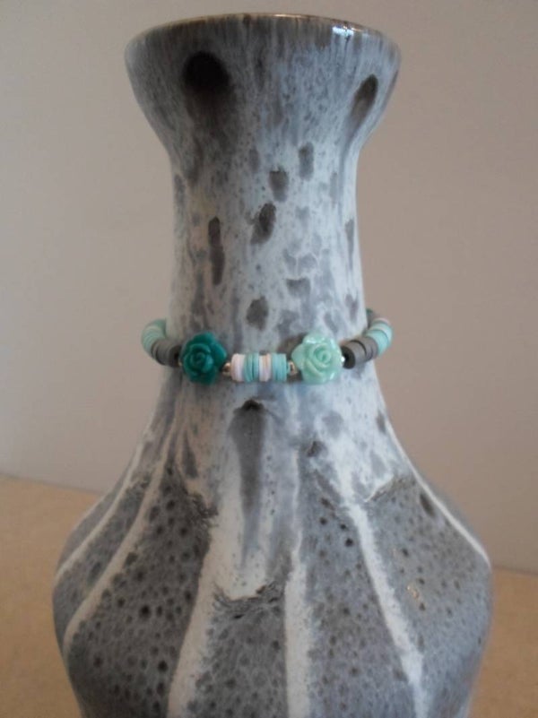 zilverkleurige kralen en 2 groene acryl rozen